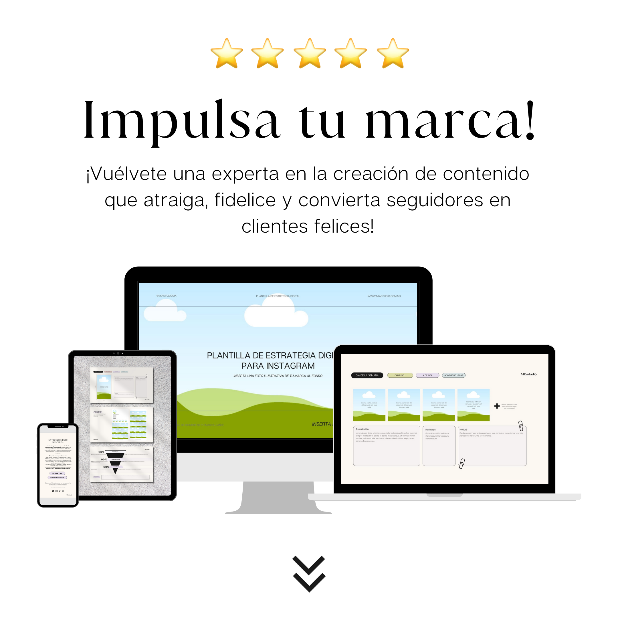 Con nuestra plantilla, podrás crear una estrategia sólida y exitosa que posicionará tu marca en Instagram. Tu cuenta se convertirá en un imán de seguidores y clientes.